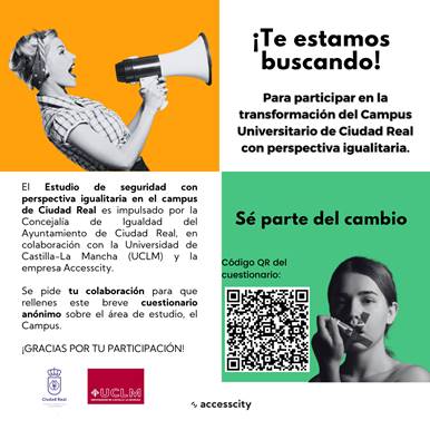 Desde la Concejalía de Igualdad del Ayuntamiento de Ciudad Real, en colaboración con la Universidad de Castilla-La Mancha (UCLM) y la empresa Accesscity, estamos realizando un Estudio de seguridad con perspectiva igualitaria en el campus universitario de Ciudad Real.