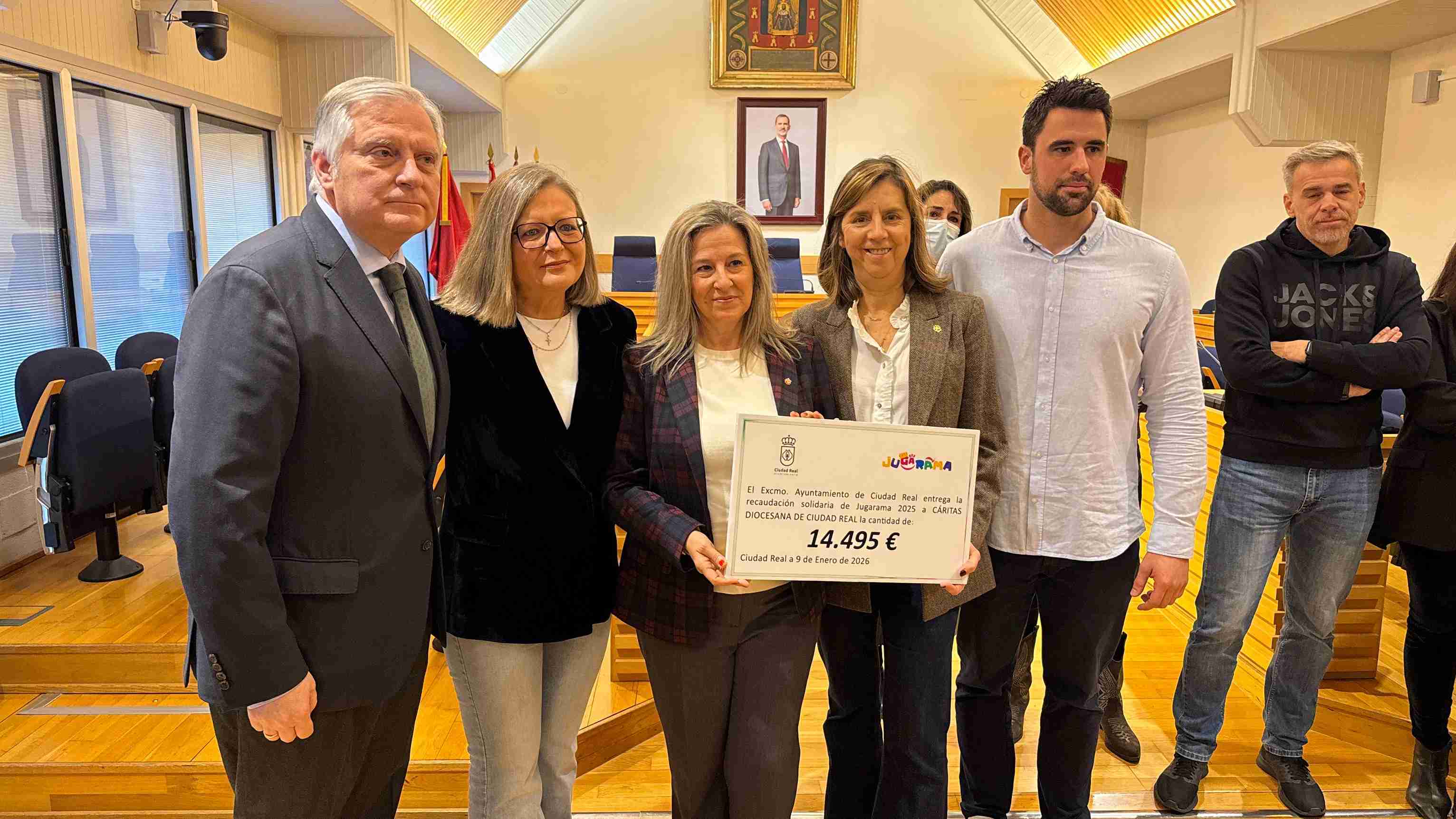El Ayuntamiento de Ciudad Real ha hecho hoy entrega de los galardones de los diferentes concursos organizados en Navidad a través de las concejalías de Turismo, Festejos y Educación. El salón municipal de plenos ha acogido el acto en el que además, las concejalías de Servicios Sociales y Juventud han otorgado a Cáritas Diocesana un cheque por importe de 14.495 euros como aportación solidaria de Jugarama 2025/2026.