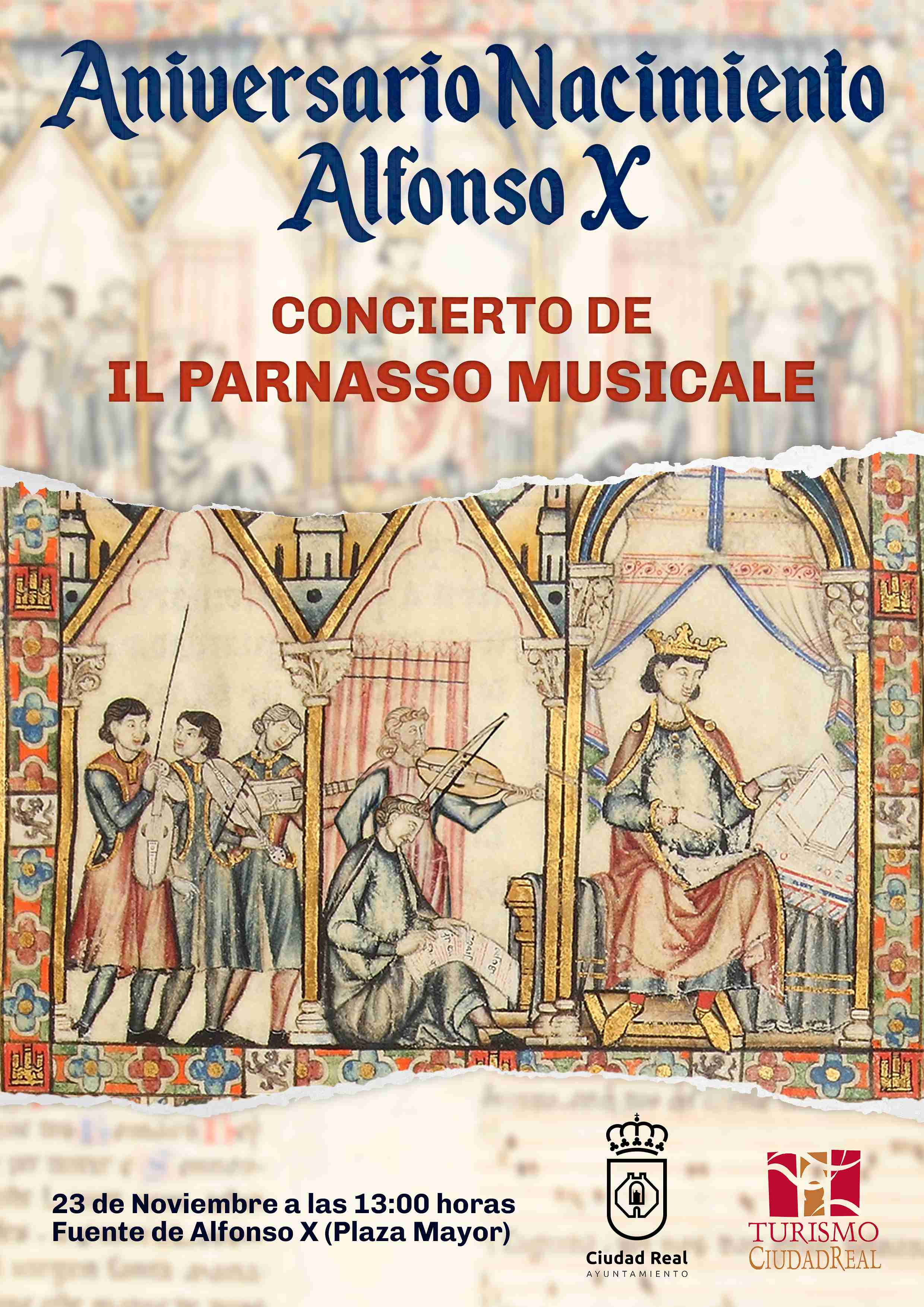 El Ayuntamiento de Ciudad Real, a través de la Oficina de Turismo, ha organizado un concierto extraordinario de música alfonsí en la Plaza Mayor, a cargo del grupo Il Parnasso Musicale, que se celebrará este próximo domingo a las 13:00 horas con motivo del aniversario del nacimiento de Alfonso X el Sabio, fundador de la ciudad y una de las figuras más influyentes en la historia del conocimiento, la literatura y la cultura en España.